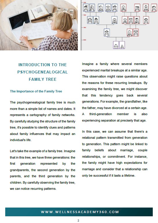 Each step of this journey is designed to guide you toward a better understanding of psychogenealogy and its impact on your emotional and mental well-being. In addition to theory, you'll have access to practical exercises adapted to different objectives: identification of family patterns, release of emotional blockages, or reconciliation with your personal history. These practices will allow you to apply your new knowledge in a concrete way, adapted to your needs.